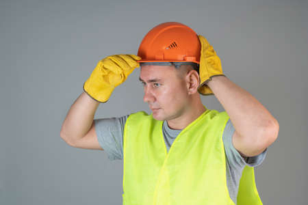 Portrait of a builder in a reflective vest and protective gloves wearing an orange hardhat