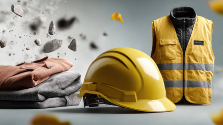 This image showcases essential safety gear combining a hard hat and reflective vest with soft fabrics, emphasizing protection in a dynamic construction environment.