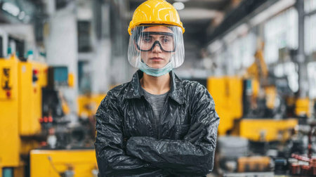 This image showcases an industrial worker wearing safety gear in a modern factory setting. The worker displays determination and focus amidst advanced machinery.