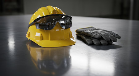Close-up of essential safety gear including gloves, goggles, a hard hat, and a caution sign on a work surface, emphasizing the importance of workplace safety and protection.