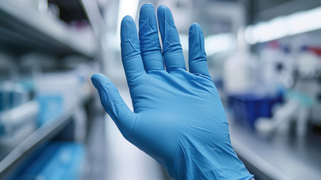 A person wearing a latex glove on their hand with the palm facing up, AI
