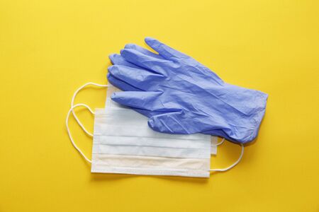 Medical protective mask, rubber gloves, on a yellow background. Covid-19 antivirus protection kit. the view from the top