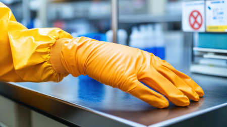 A close-up image of a single orange rubber glove resting on a laboratory table, highlighting safety and cleanliness in a professional workspace environment.