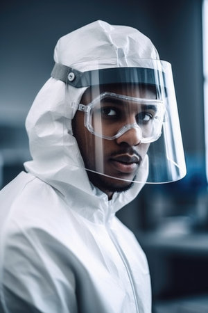 shot of a young male scientist wearing protective clothing in a lab, created with generative ai