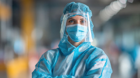 Healthcare worker wears full PPE, showing a commitment to safety and patient care in a medical facility during a busy day of operations and treatment.