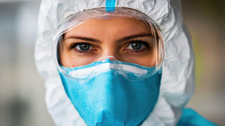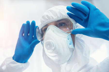 Portrait of protected woman with safety suit, glasses and mask before a pandemic or virus