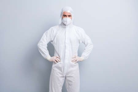 Photo of serious confident guy expert virology center clinic arms by sides visit patient wear face mask hood uniform suit plastic facial protection eyes nose isolated grey color background