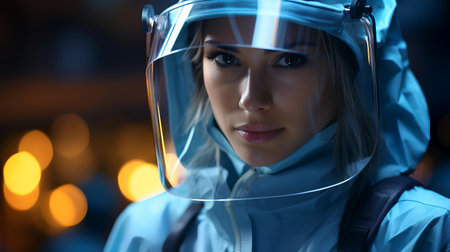 Portrait of a beautiful young woman astronaut in space suit and helmet.