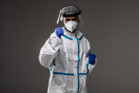 Man doctor in overall protection hazmat suit fighting pandemic on gray background