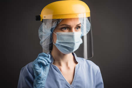 nurse in medical mask, cap and face shield isolated on dark gray