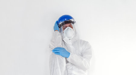 Doctor wearing PPE suit uniform is stressed and headache after long shift fighting against Coronavirus SARS-CoV-2
