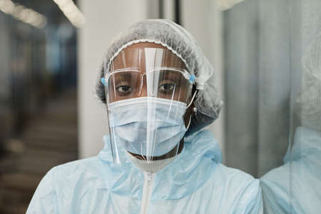Face of tired Black medical nurse in PPE suit, medical mask and face shield protecting from coronavirus