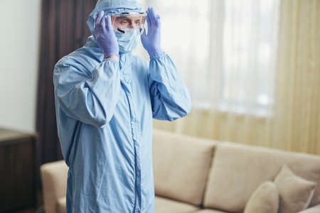 Portrait of doctor in mask and in protective equipment uniform.
