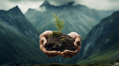 A hand cradles a small tree with a backdrop of a mountain range. The scene exhibits a naturalistic aesthetic, with muted greens and browns dominating. The composition uses a shallow depth of field, focusing on the tree. Suitable for environmental or conservation themed projects, and editorial articles.