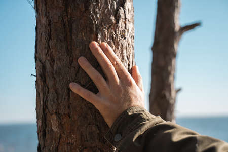Man touching to the tree trunk with bark texture while walking at the nature