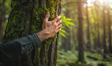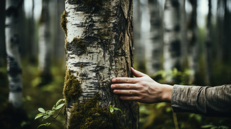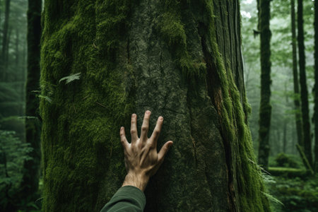Amidst a tranquil forest, a hand gently touches a tree trunk, symbolizing a deep connection with nature. the image evokes themes of energy, sustainability, and environmental dependency, the serene beauty of green forests.