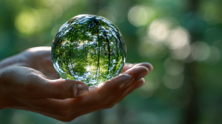 A hand gently cradles a glossy, spherical mirror reflecting a vibrant canopy of foliage, contrasting sharp details with a dreamy, out-of-focus background.