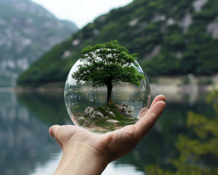 A hand cradles a transparent glass globe containing a small tree, set against a blurred green backdrop. The image features natural light and a shallow depth of field, highlighting the globe and tree's details. This conceptual composition could be used for illustrations related to sustainability or environmental themes.