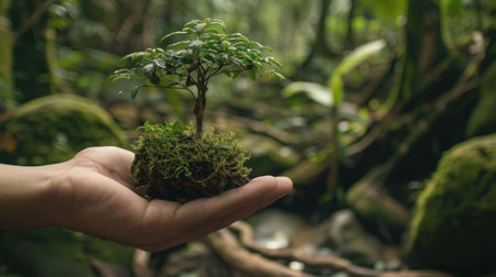 Peaceful Harmony Hand holding small bonsai tree amidst lush tropical rainforest nature backdrop