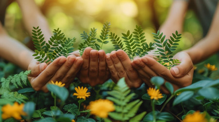 Hands holding delicate yellow flowers with green leaves, representing nature, beauty, and growth