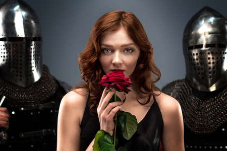 Beautiful girl in a black dress and a red rose in her hand next to a two knights in armor