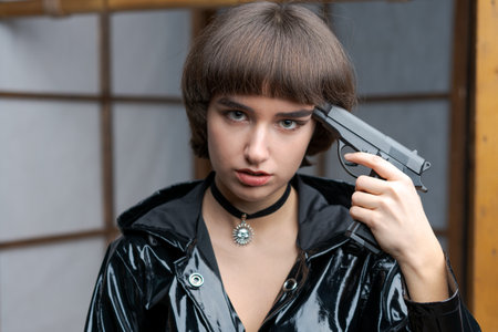 Portrait beautiful young caucasian woman in black patent suit with one hand holding pistol to her head, young sexy short hair girl with pistol looking at camera, pretty women are standing with pistol