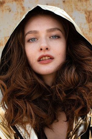Portrait of white girl in hood with rusty metal background