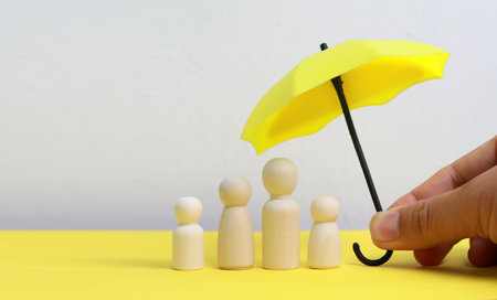 Conceptual image of insurance. Businessman holding yellow umbrella protecting people figure.
