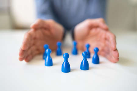 Close-up Of A Person's Hand Protecting Blue Pawns Forming Circle