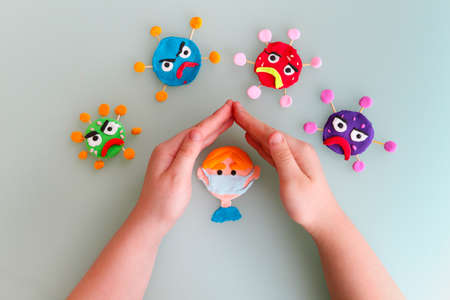 Viral epidemic influenza. Clay characters on yellow background with hands of the kid.