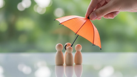 A hand holds an umbrella over wooden peg figures, illustrating the concept of business and family protection, emphasizing security and essential risk management.