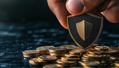 Close-up Of A Human Hand Holding Shield Security Icon Besides Piggybank On Wooden Desk