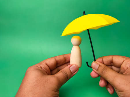 Top view pair a wooden doll protect with a red umbrella on a green background with copy space text. The concept of insurance coverage.