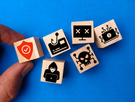 Wooden cubes with cyber icons with the concept of network security vulnerabilities