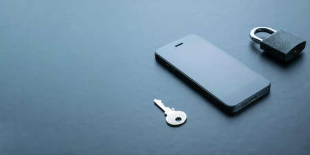 Mobile security. Modern space gray mobile phone with padlock, key on dark background. Identity theft and cyber security concept