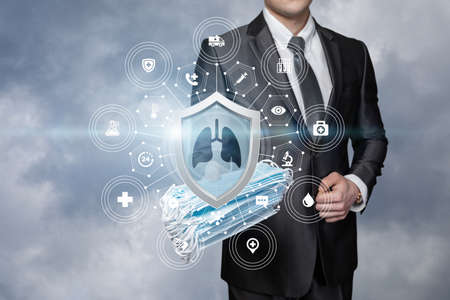 The concept of lung protection with masks. A man shows protective masks in front of a shield against the background of the sky.