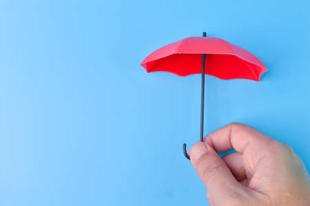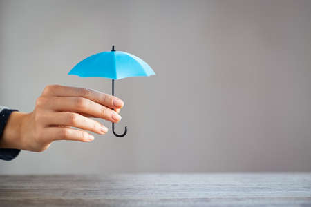 Close up hand of young woman holding small umbrella on table with copy space. Woman holding small light blue umbrella as sign of protection on desk against grey wall. Girl protect something to be placed on the table.