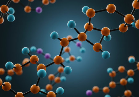 Detailed representation of a molecular structure featuring interconnected atoms in orange, blue, and purple. The image evokes scientific concepts, research, and the building blocks of life.