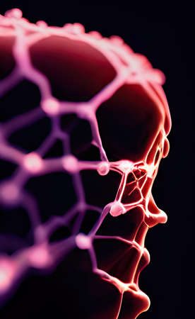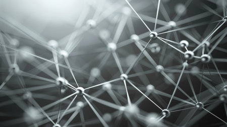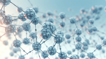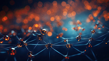This abstract image showcases a captivating representation of molecular structures featuring suspended particles connected by delicate fibers, ideal for science and technology themes.