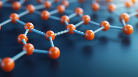 Intricate close-up view of a molecular structure featuring orange spheres connected by blue lines. Ideal for scientific and educational projects, this image showcases the foundational concepts of chemistry and molecular bonding.