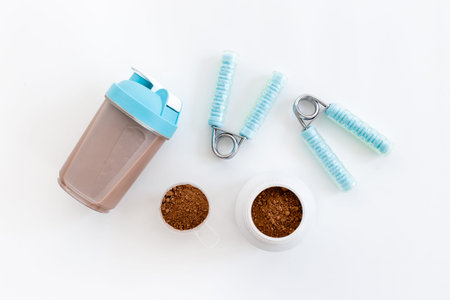 Chocolate protein shake and dumbbells isolated on white background. Copyspace