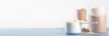 Different protein flavors in plastic scoops. Protein powder shakes for weight loss, set every day protein goals, sport and fitness, healthy lifestyle