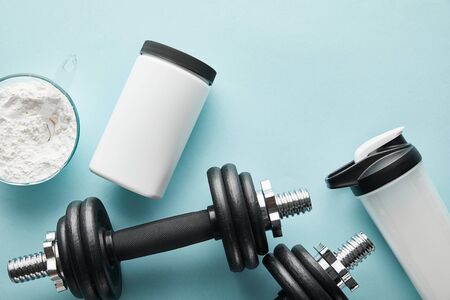 top view of dumbbells near sports bottle and protein powder on blue