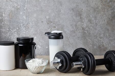 dumbbells near protein shake in sports bottle and protein powder near concrete wall