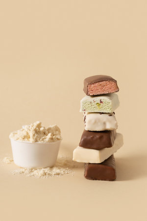 Different whey protein bars with various coatings and sprinkles scoop of protein powder on beige background. Fitness nutrition. Vertical format.