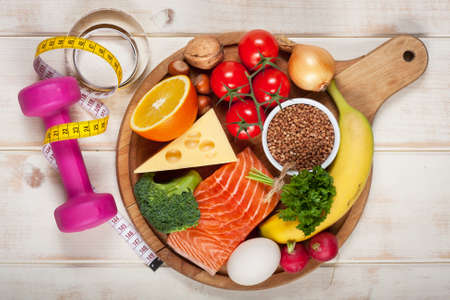 Healthy lifestyle and nutrition eating concept. Food with sports fitness equipment
