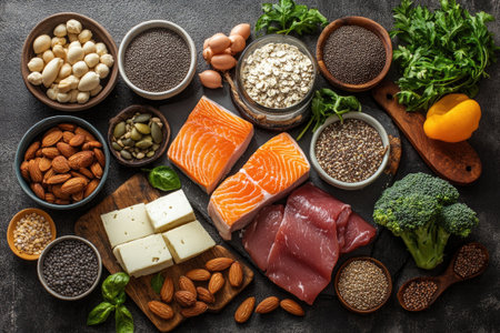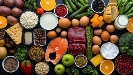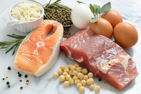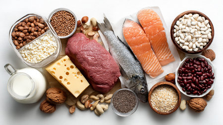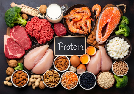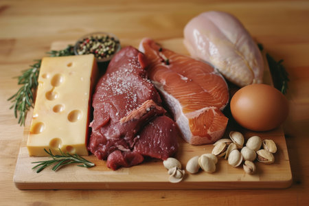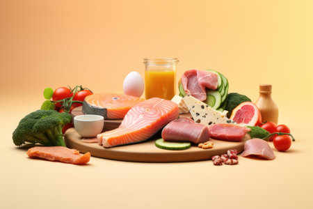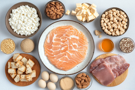 Healthy Balanced Diet: Assorted Protein Sources Including Fresh Salmon, Chicken, and Cheese