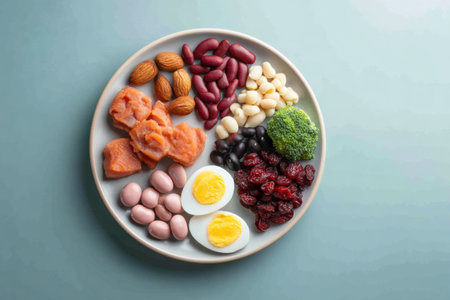 A selection of kidney-friendly foods is beautifully arranged on a plate, featuring nuts, beans, eggs, fish, and broccoli for nutritious meal ideas