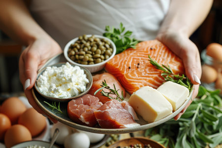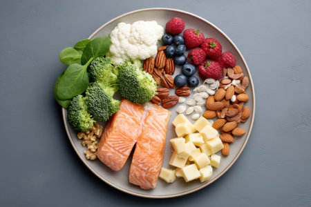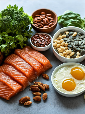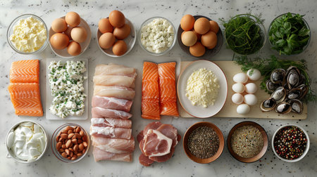 Fresh salmon, eggs, nuts, and greens arranged beautifully for a healthy keto meal preparation concept