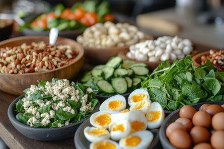 Colorful bowls filled with fresh spinach, cucumbers, nuts, and boiled eggs create a healthy meal prep setup. This arrangement highlights nutritious ingredients for balanced meals.
